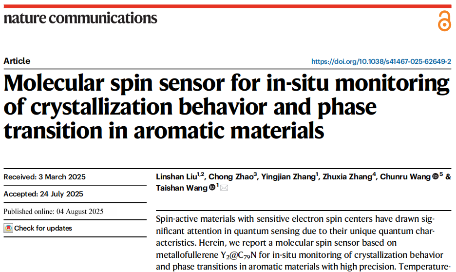 论文详情:Linshan Liu, Chong Zhao, Yingjian Zhang, Zhuxia Zhang, Chunru Wang, Taishan Wang*. Molecular spin sensor for in-situ monitoring of crystallization behavior and phase transition in aromatic materials, Nat. Commun.202516, 7170.